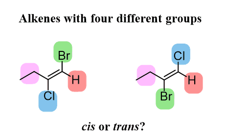 To illustrate this limitation, let’s consider two isomeric alkenes having four different groups on the double bond.