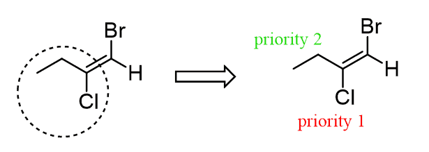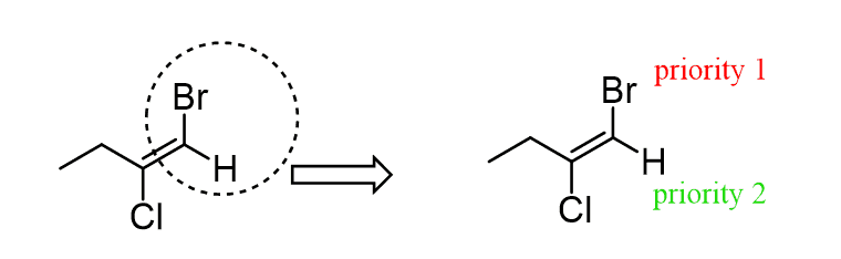 On the right carbon, we need to compare a hydrogen with a Br atom. Clearly, the Br has a higher priority: