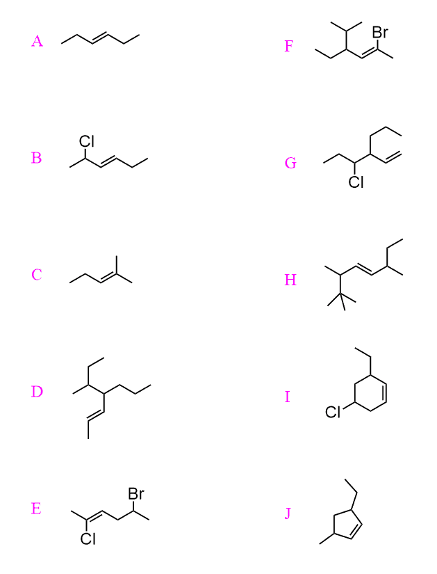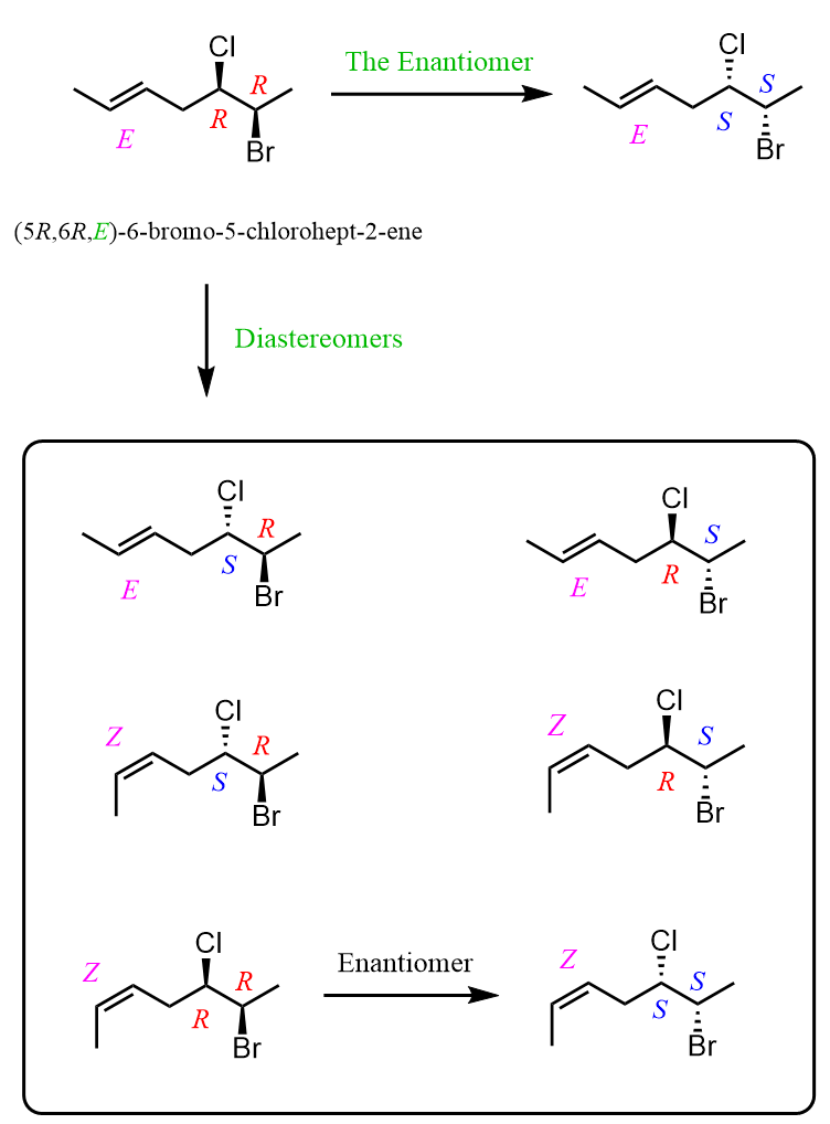 To generalize this pattern, let’s add another chiral center and consider the stereoisomers of 6-bromo-5-chlorohept-2-ene.