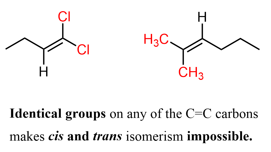 Notice that we are talking about identical atoms or groups on the same carbon atom of the double bond. Cis and trans isomerism is only possible if both carbons in the C=C have two different atoms or groups attached.