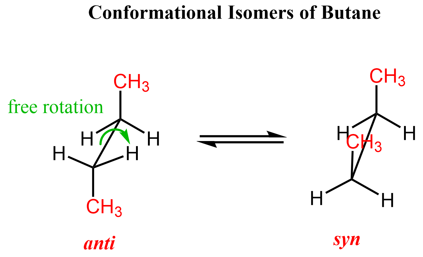 These two are conformational isomers of butane, which are interconverted via free rotation about the central C-C single bond. When the large groups are aligned, at 0o dihedral angle, we have the syn conformation, and when they are at 180o, we have the anti-conformation.