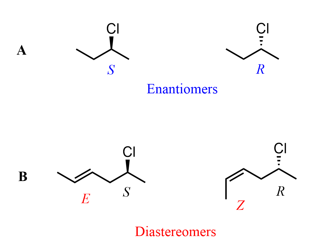For example, R and S 2-chlorobutanes are enantiomers because the molecules have one chiral center, and it is inverted. However, if we add a double bond to them while altering the E and Z configuration, they are no longer enantiomers – they become diastereomers.