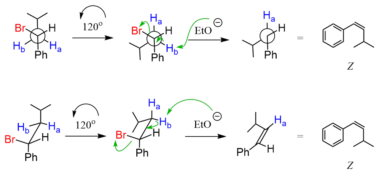 So the elimination can occur from both conformations of the substrate since there are two β hydrogens. This is a stereoselective elimination – the molecule “selects” which β hydrogen to use to produce the most stable alkene (E is more stable than Z).