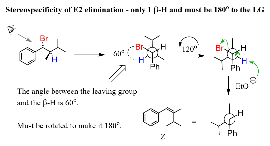 In this case, there’s only one β hydrogen and therefore only one confirmation that allows us to put it at 180o with the Br. It is not the most stable conformation, but the molecule has no choice, as that is a requirement. Therefore, this is a stereospecific reaction.
