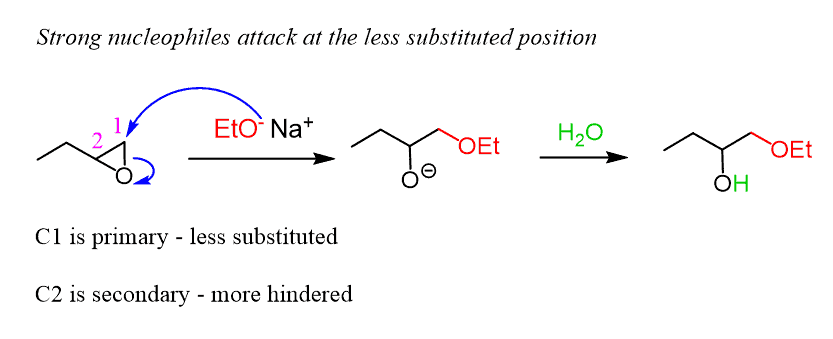 There are two main differences we need to remember. Good nucleophiles attack the less substituted carbon of the epoxide by the SN2 mechanism, forming an alkoxide io,n which is protonated by acidic workup to the corresponding alcohol: