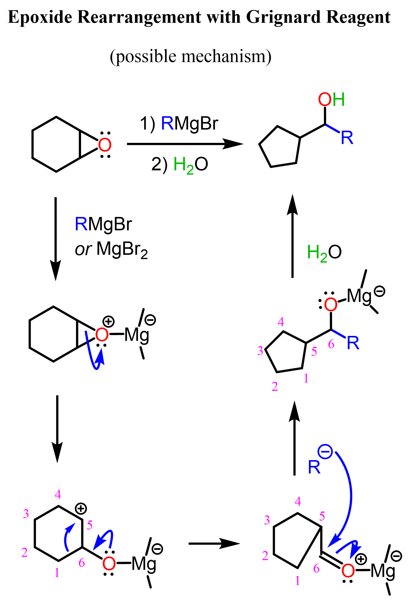 Grignard reagents are great nucleophiles and strong bases; therefore, they attack epoxides at the less substituted carbon atom. Overall, the addition of Grignard reagents to epoxides is a two-step process through which an alcohol is formed. In the first step, the epoxide ring is attacked at the least substituted carbon atom, forming an alkoxide intermediate, which is then treated with water or acidic workup to give the final product alcohol: