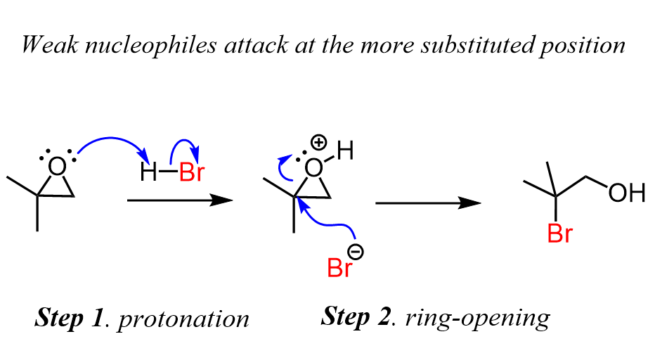 On the contrary, in reactions with poor nucleophiles, the epoxide must first be activated by protonation, and only after this, the nucleophilic attack occurs. Importantly, the addition of poor nucleophiles occurs on the more substituted carbon atom: