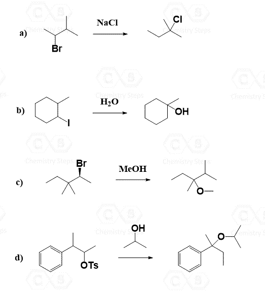 Alkyl halides react with water by SN1 mechanism forming alcohols. Let’s put together some examples of these hydrolysis reactions of alkyl halides and address some important concepts such as the mechanisms, stereochemistry, the relationship of products, and different types of rearrangements: