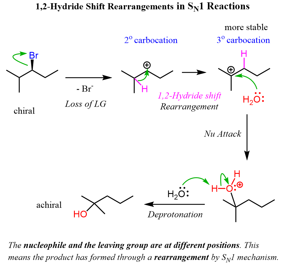 Notice that the chirality of the middle carbon is lost upon the hydride shift because carbocations are sp2-hybridized and only have three atoms connected to the positively charged carbon. Because of symmetrical structures, the nucleophilic attack of water produces an achiral alcohol.