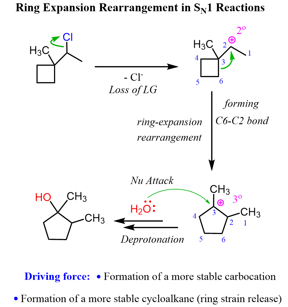 A common type of carbocation rearrangement is the ring expansion of 4 or 5-membered cycloalkanes. The driving force in these reactions is both the increased stability of carbocations (2o-3o) and the ring itself. Remember, 4-membered rings have quite a high ring strain, which is released when expanded to a 5-membered ring. Reaction 8 is an example of ring-expansion rearrangement in an SN1 reaction: