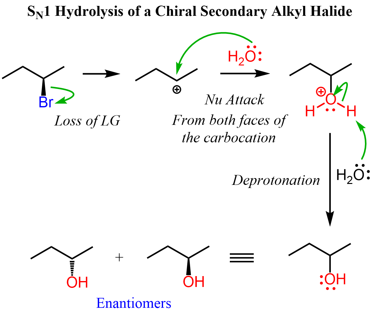 If the leaving group in the substrate is part of a chirality center, then SN1 substitution will give a mixture of enantiomers. The hydrolysis of (R)-2-bromobutane in reaction 1 is such an example. In the first step, a secondary butyl carbocation is formed which is attacked from both faces of the planar carbon giving a racemic mixture of enantiomers: