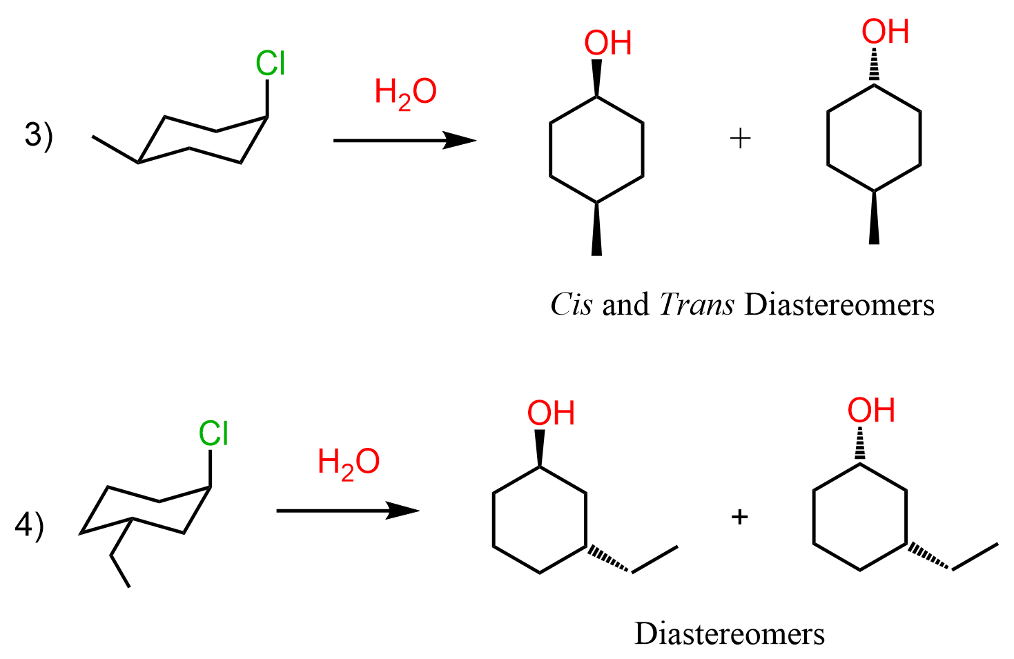 Reactions 2, 3, 4, and 5 are examples of SN1 reactions where the product is formed as a pair of diastereomers. Generally, this happens if the substrate has two chiral centers. One of them is racemized during the substitution, while the other stays intact, thus a mixture of diastereomers is obtained (reactions 2, 4, and 5).