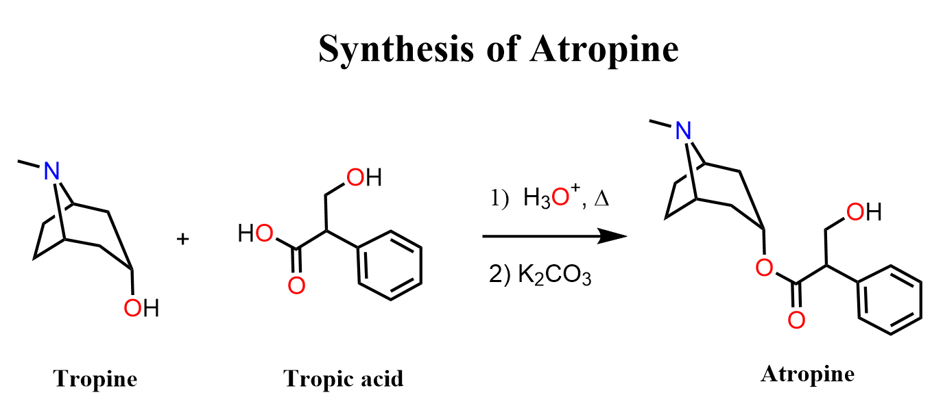 Two main building blocks make up Atropine, and they react in the final step of its synthesis. These are Tropine and Tropic Acid (I will show the reaction here).