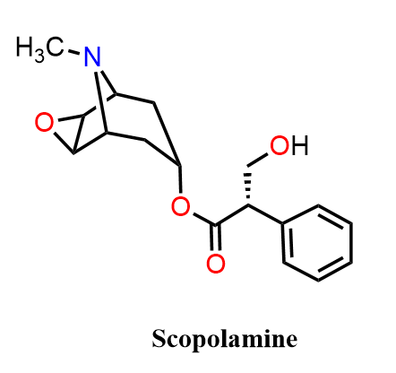 Scopolamine (also known as hyoscine) differs from atropine and hyoscyamine by having an epoxide (bridge) in the tropane ring, which increases its ability to cross the blood–brain barrier. As a result, scopolamine has strong central nervous system depressant effects, making it especially effective for preventing motion sickness, treating postoperative nausea, and reducing excessive salivation. At higher doses, it produces sedation, amnesia, and sometimes hallucinations.