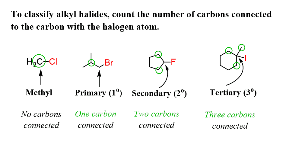 - Depending on the number of carbon atoms connected to the carbon bearing the halogen, there can be primary, secondary, or tertiary alkyl halides.