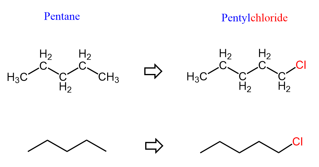 For example, let’s draw the bond-line structure of pentane and replace one of the terminal hydrogens with a chlorine atom:
